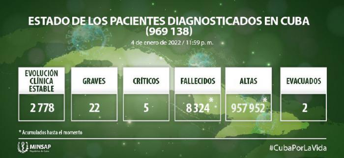 De los 969 mil 138 pacientes diagnosticados con la enfermedad, se mantienen ingresados 2805, de ellos 2778 con evolución clínica estable. Se acumulan 8 mil 324 fallecidos (0 en el día), letalidad de 0,86% vs 1,86% en el mundo y 2,26% en Las Américas; dos evacuados, 55 retornados a sus países, en el día hubo 537 altas, se acumulan 957 mil 952 pacientes recuperados (98,8%). Se atienden en las terapias intensivas 27 pacientes confirmados de ellos 5 críticos y 22 graves.