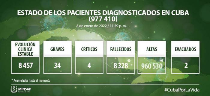 De los 977 mil 410 pacientes diagnosticados con la enfermedad, se mantienen ingresados 8 mil 495, de ellos 8 mil 457 con evolución clínica estable. Se acumulan 8 mil 328 fallecidos (2 en el día), letalidad de 0,85% vs 1,81 % en el mundo y 2,19 % en Las Américas; dos evacuados, 55 retornados a sus países, en el día hubo 852 altas, se acumulan 960 mil 530 pacientes recuperados (98,3%). Se atienden en las terapias intensivas 38 pacientes confirmados de ellos 4 críticos y 34 graves.