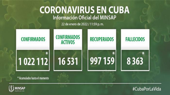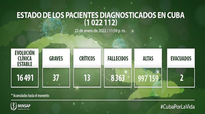 De 1 millón 022 mil 112 de pacientes diagnosticados con la enfermedad, se mantienen ingresados 16 531, de ellos 16 491 con evolución clínica estable. Se acumulan 8 mil 363 fallecidos (5 en el día), letalidad de 0,82 % vs 1,61 % en el mundo y 1,94 % en Las Américas; dos evacuados, 57 retornados a sus países, en el día hubo 3 941 altas, se acumulan 997 mil 159 pacientes recuperados (97,5 %). Se atienden en las terapias intensivas 50 pacientes confirmados de ellos 13 críticos y 37 graves.