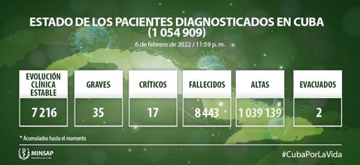 Del millón 054 mil 909 de pacientes diagnosticados con la enfermedad, se mantienen ingresados 7 mil 268, de ellos 7 mil 216 con evolución clínica estable. Se acumulan 8 mil 443 fallecidos (4 en el día), letalidad de 0,80% vs 1,46% en el mundo y 1,81% en Las Américas; dos evacuados y 57 retornados a sus países. En el día hubo mil 341 altas, se acumulan 1 millón 039 mil 139 pacientes recuperados (98,5%). Se atienden en las terapias intensivas 52 pacientes confirmados de ellos 17 críticos y 35 graves.