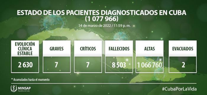 Del millón 077 mil 966 de pacientes diagnosticados con la enfermedad, se mantienen ingresados 2 mil 644 de ellos 2 mil 630 con evolución clínica estable. Se acumulan 8 mil 503 fallecidos (no se reportaron fallecidos en el día), letalidad de 0,79% vs 1,32%en el mundo y 1,78% en Las Américas; dos evacuados y 57 retornados a sus países. En el día hubo 610 altas, se acumulan 1 millón 066 mil 760 pacientes recuperados (99,0%). Se atienden en las terapias intensivas 14 pacientes confirmados de ellos 7 críticos y 7 graves.