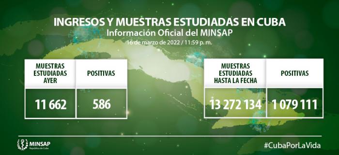 Para la COVID-19 se realizaron un total de 11 mil 662 muestras para la vigilancia en el día, resultando positivas 586 para 5,0 % de positividad. El país acumula 13 millones 272 mil 134 muestras realizadas y 1 millón 079 mil 111 positivas (8,1 %).