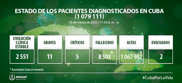 Del millón 079 mil 111 de pacientes diagnosticados con la enfermedad, se mantienen ingresados 2 mil 567, de ellos 2 mil 551 con evolución clínica estable. Se acumulan 8 mil 503 fallecidos (no se reportaron fallecidos en el día), letalidad de 0,79 % vs 1,31 % en el mundo y 1,78 % en Las Américas; dos evacuados y 57 retornados a sus países. En el día hubo 610 altas, se acumulan 1 millón 067 mil 982 pacientes recuperados (99,0 %). Se atienden en las terapias intensivas 16 pacientes confirmados de ellos cinco críticos y 11 graves.
