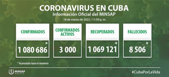 Del millón 080 mil 686 de pacientes diagnosticados con la enfermedad, se mantienen ingresados 3 mil, de ellos 2 mil 982 con evolución clínica estable. Se acumulan 8 mil 506 fallecidos (2 en el día), letalidad de 0,79% vs 1,3%en el mundo y 1,78% en Las Américas; dos evacuados y 57 retornados a sus países. En el día hubo 590 altas, se acumulan un millón 069 mil 121 pacientes recuperados (99,0%). Se atienden en las terapias intensivas 18 pacientes confirmados de ellos 5 críticos y 13 graves.