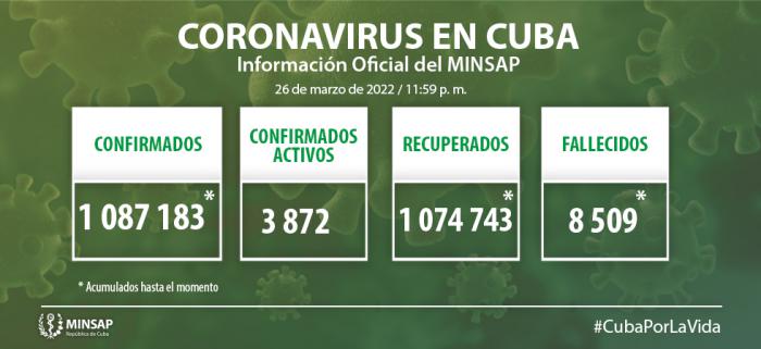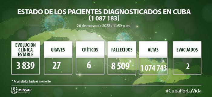 Del millón 087 mil 183 de pacientes diagnosticados con la enfermedad, se mantienen ingresados 3 mil 872, de ellos 3 mil 839 con evolución clínica estable. Se acumulan 8 mil 509 fallecidos (no se reporta ningún fallecido en el día), letalidad de 0,78 % vs 1,28 % en el mundo y 1,79 % en Las Américas; dos evacuados, 57 retornados a sus países, en el día hubo 730 altas, se acumulan 1 millón 074 mil 743 pacientes recuperados (98.9 %). Se atienden en las terapias intensivas 33 pacientes confirmados de ellos seis críticos y 27 graves.