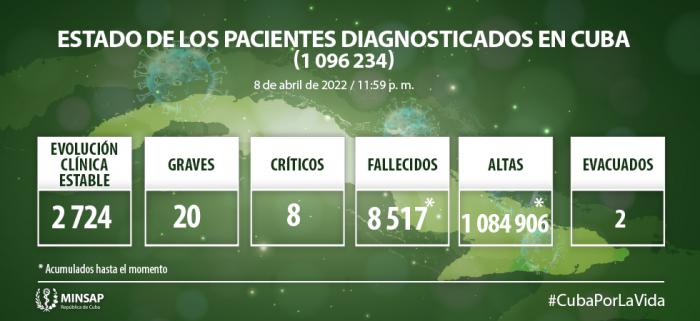 Del millón 096 mil 234 de pacientes diagnosticados con la enfermedad, se mantienen ingresados 2 mil 752, de ellos 2 mil 724 con evolución clínica estable. Se acumulan 8 mil 517 fallecidos (no se reportan fallecidos en el día), letalidad de 0.78% vs 1,25% en el mundo y 1,79% en Las Américas; dos evacuados, 57 retornados a sus países, en el día hubo 702 altas, se acumulan 1 millón 084 mil 906 (99,0%). Se atienden en las terapias intensivas 28 pacientes confirmados de ellos 8 críticos y 20 graves.
