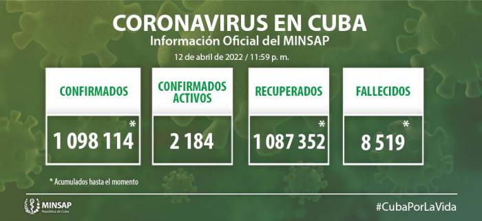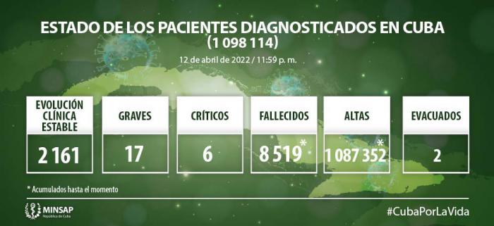 Del 1 millón 098 mil 114 de pacientes diagnosticados con la enfermedad, se mantienen ingresados 2 184, de ellos 2 161 con evolución clínica estable. Se acumulan 8 mil 519 fallecidos (0 en el día), letalidad de 0.78% vs 1,24% en el mundo y 1,78% en Las Américas; dos evacuados, 57 retornados a sus países, en el día hubo 622 altas, se acumulan 1 millón 087 mil 352 (99,0%).