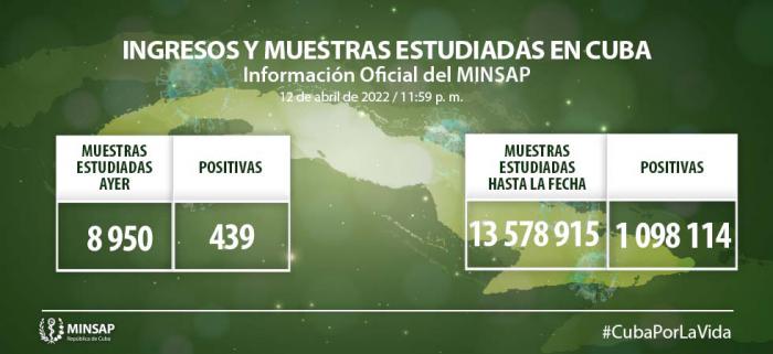 Para la COVID-19 se realizaron un total de 8 mil 950 muestras para la vigilancia en el día, resultando positivas 439. El país acumula 13 millones 578 mil 915 muestras realizadas y 1 millón 098 mil 114 positivas.