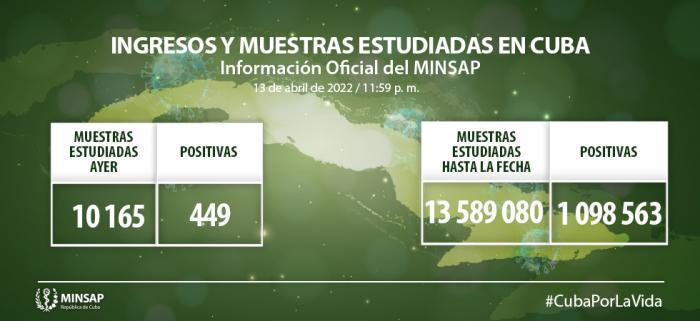 Para la COVID-19 se realizaron un total de 10 mil 165 muestras para la vigilancia en el día, resultando positivas 449. El país acumula 13 millones 589 mil 080 muestras realizadas y 1 millón 098 mil 563 positivas.