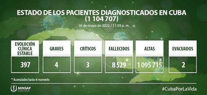 Del millón 104 mil 707 de pacientes diagnosticados con la enfermedad, se mantienen ingresados 404, de ellos 397 con evolución clínica estable. Se acumulan 8 mil 529 fallecidos (no se reportaron fallecidos en el día), letalidad de 0,77% vs 1,21% en el mundo y 1,76% en las Américas; dos evacuados, 57 retornados a sus países, en el día hubo 110 altas, se acumulan 1 millón 095 mil 715 (99,2%). Se atienden en las Salas de Cuidados Intensivos 7pacientes confirmados, de ellos 3 críticos y 4 graves.