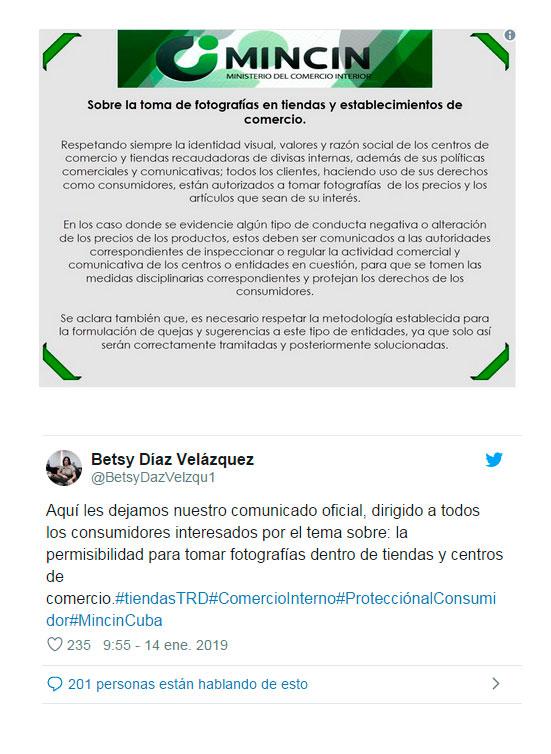 La ministra de Comercio Interior, Betsy Díaz Velázquez, expresó a través de su cuenta de twitter en esta jornada que todos los clientes “haciendo uso de sus derechos como consumidores, están autorizados a tomar fotografías de los precios y artículos que sean de su interés” en las tiendas y establecimientos de comercios.