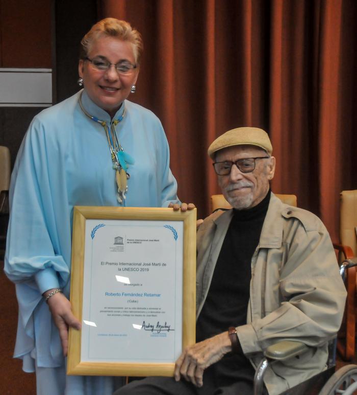 La ocasión hizo propicia la entrega del Premio Internacional José Martí de la Unesco 2019 al relevante intelectual Roberto Fernández Retamar, a quien se refiriera la representante de la Unesco en Cuba, Katherine Müller Marín, como gran representante de la vocación martiana, el cual ha favorecido el flujo de lo más auténtico de la creación universal.