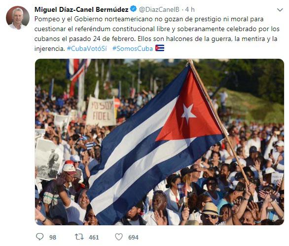 El presidente de Cuba, Miguel Díaz-Canel, advirtió en su cuenta de la red social Twitter, en la cual tiene 102 mil seguidores, que “Pompeo y el Gobierno norteamericano no gozan de prestigio ni moral para cuestionar el referéndum constitucional libre y soberanamente celebrado por los cubanos el pasado 24 de febrero”.