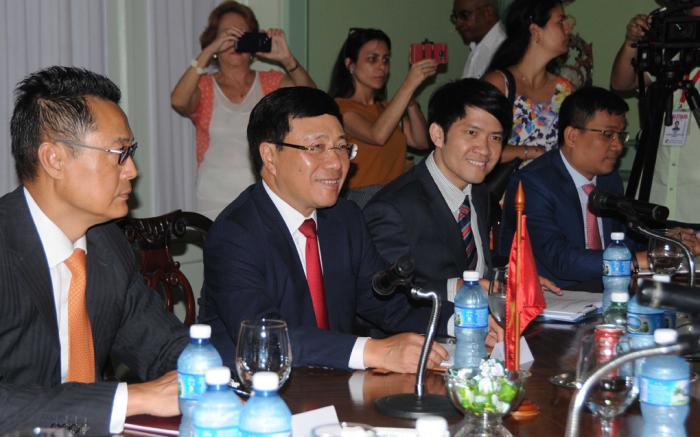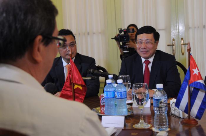 El Canciller cubano Bruno Rodríguez recibió este lunes en la capital a su homólogo y viceprimer ministro de Vietnam, Phan Binh Minh, quien realiza una visita a Cuba con el propósito de impulsar las relaciones bilaterales entre ambos países, las cuales entran en la celebración de los 60 años de instauradas de manera oficial, informó la ACN.