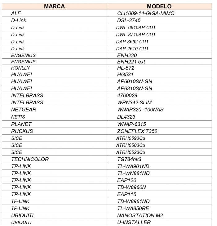 El listado contempla algunos equipos de redes inalámbricas de datos de alta velocidad (RLAN) que cumplen con los requerimientos de la nueva norma, en la cual se precisan las bandas de frecuencia para el uso: de 2400 a 2483.5 MHZ y de 5725 a 5850 MHZ.