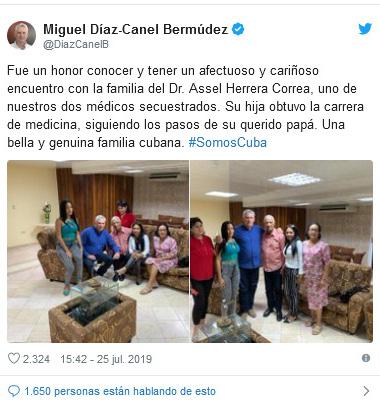 «Fue un honor conocer y tener un afectuoso y cariñoso encuentro con la familia del Dr. Assel Herrera Correa, uno de nuestros dos médicos secuestrados. Su hija obtuvo la carrera de medicina, siguiendo los pasos de su querido papá. Una bella y genuina familia cubana. #SomosCuba»