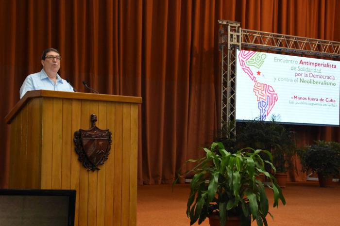 El Canciller cubano Bruno Rodríguez Parrilla inició sus palabras con el agradecimiento a la solidaridad de los presentes con la causa de Cuba y en contra del bloqueo genocida impuesto por el gobierno de los Estados Unidos, que extrema "su ingerencia en nuestros países". El derecho internacional es cotidianamente vulnerable por la vigencia de la Doctrina Monroe de la administración norteamericana.