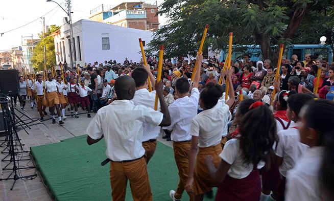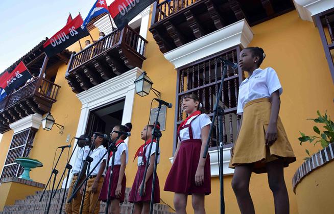Antes de iniciar el acto, estudiantes de las enseñanzas primaria y secundaria básica rememoraron simbólicamente el asalto a la otrora estación de policía.