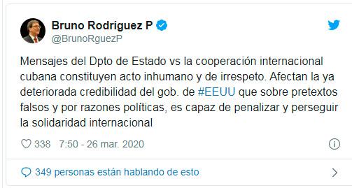 "Mensajes del Dpto de Estado vs la cooperación internacional cubana constituyen acto inhumano y de irrespeto. Afectan la ya deteriorada credibilidad del gob de #EEUU que sobre pretextos falsos y por razones políticas, es capaz de penalizar y perseguir la solidaridad internacional", tuiteó el canciller.