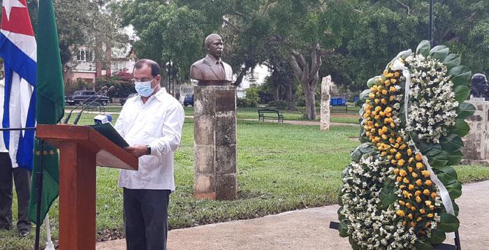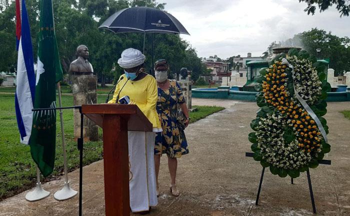 Al intervenir durante la ceremonia, Thaninga Pandit Shope-Linney, embajadora de la República de Sudáfrica en Cuba, país que ostenta la presidencia protémpore de la Unión Africana, aprovechó la oportunidad para agradecer a las autoridades cubanas haber facilitado la conmemoración de esta fecha cuando en todo el mundo se celebra de manera virtual debido a los estragos de la COVID-19, siendo conscientes del llamado necesario a permanecer en casa.