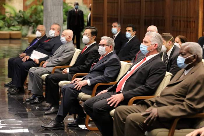 Estuvieron presentes el General de Ejército, Raúl Castro Ruz; el miembro del Buró Político y presidente de la República de Cuba, Miguel Díaz-Canel Bermúdez; el presidente del Consejo de Estado y de la Asamblea Nacional del Poder Popular, Esteban Lazo Hernández; el también miembro del Buró Político y ministro de Relaciones Exteriores, Bruno Rodríguez Parrilla y el embajador de la República Popular de China, compañero Chen Xi.