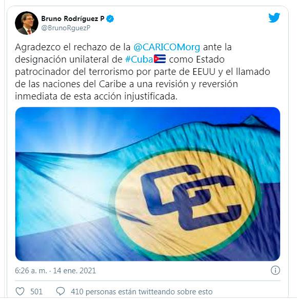 “Agradezco el rechazo de la @CARICOMorg ante la designación unilateral de #CubaBandera de Cuba como Estado patrocinador del terrorismo por parte de EEUU y el llamado de las naciones del Caribe a una revisión y reversión inmediata de esta acción injustificada”, tuiteó.