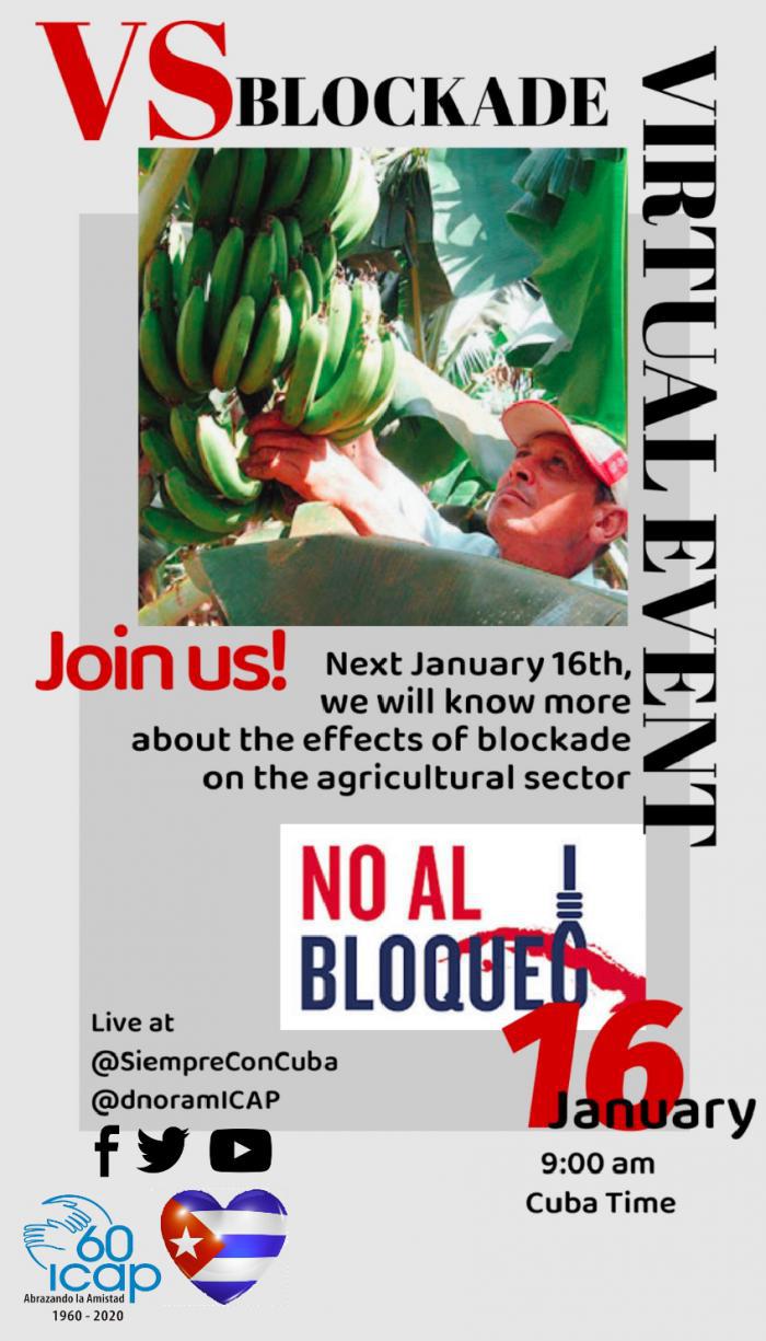 En un encuentro virtual organizado por el Instituto Cubano de Amistad con los Pueblos (ICAP), el funcionario señaló que las leyes de esa injusta política injerencista privan a los productores cubanos de acceder al mercado y a las tecnologías estadounidenses para garantizar sus cosechas, limitándolos en la compra de insumos, fertilizantes, plaguicidas, equipos de riego, maquinarias y otros equipamientos necesarios.