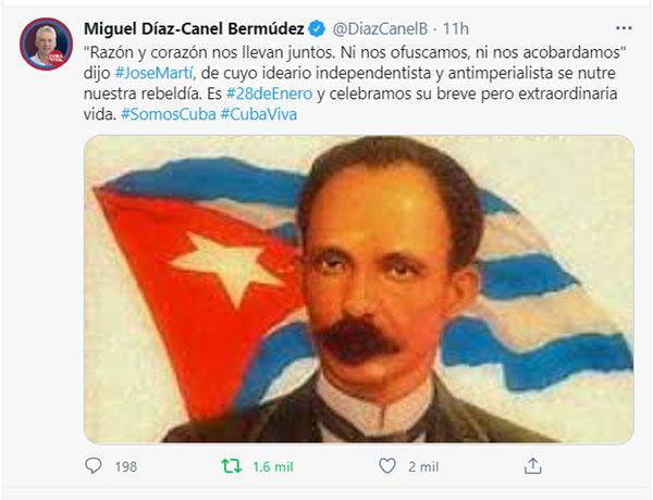 Díaz-Canel compartió en su tuit una frase del apóstol: "Razón y corazón nos llevan juntos. Ni nos ofuscamos, ni nos acobardamos".