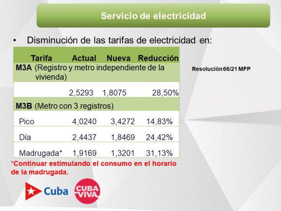 Reiteró que hay una disminución importante de este servicio para todas las producciones del sector agropecuario. Además, cuando se aplican tarifas M3A (cuando tenemos un registro y metro independiente de la vivienda) se produce una rebaja de la tarifa de los servicios eléctricos y que prácticamente será de un 28,5 %, puntualizó.
