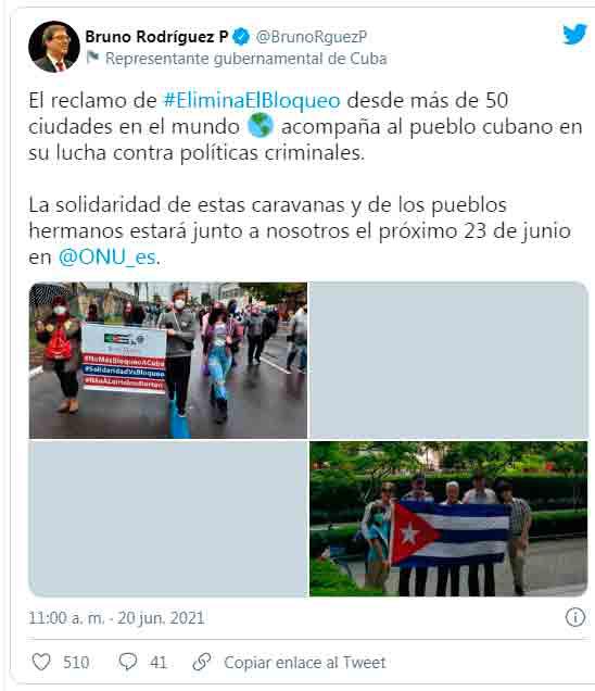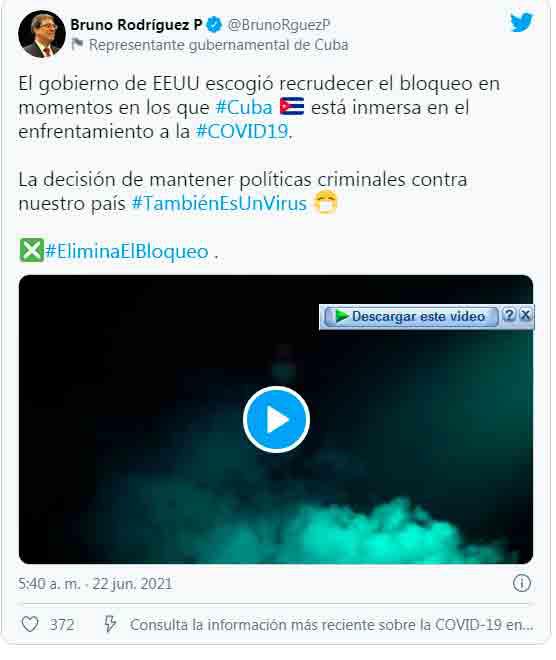 “El gobierno de EEUU escogió recrudecer el bloqueo en momentos en los que #Cuba está inmersa en el enfrentamiento a la #COVID19.La decisión de mantener políticas criminales contra nuestro país #TambiénEsUnVirus”, tuiteó.