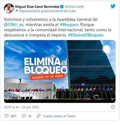 “Volvimos y volveremos a la Asamblea General de la ONU mientras exista el bloqueo. Porque respetamos a la comunidad internacional, tanto como la desconoce e irrespeta el imperio”, agregó Díaz-Canel.