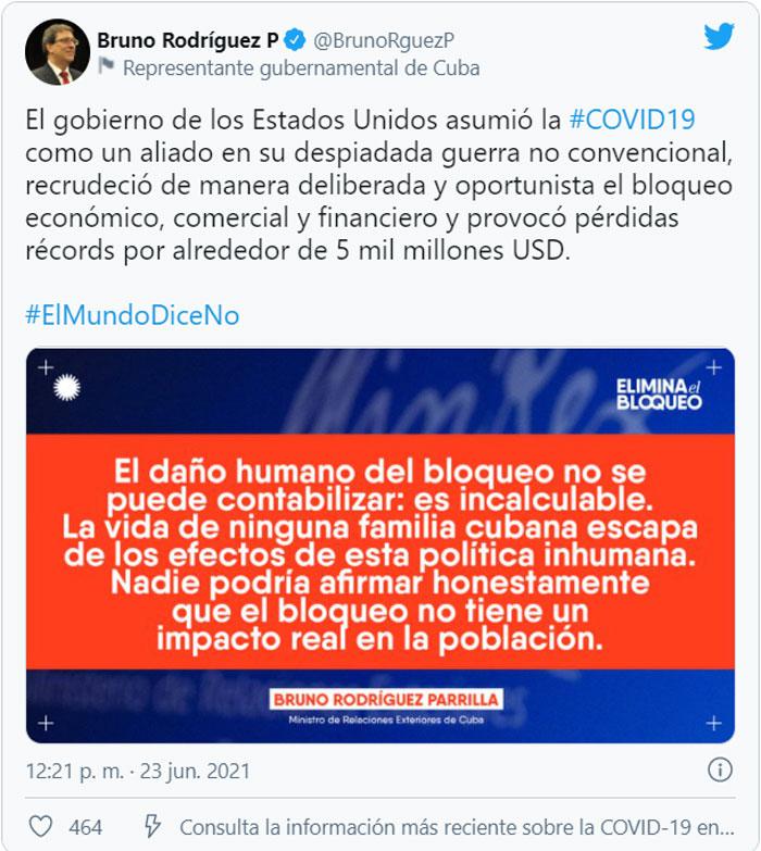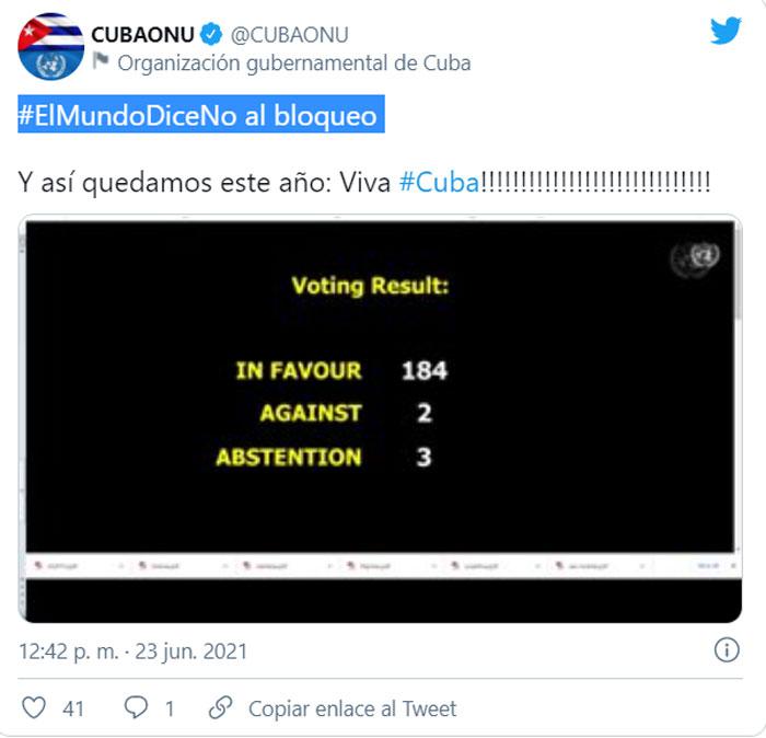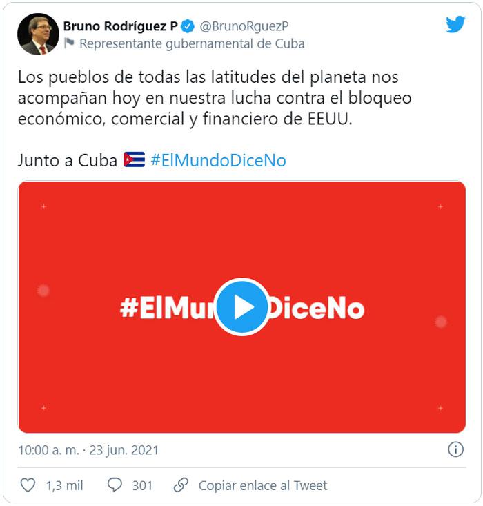 Por su parte, el canciller cubano manifestó: «Los pueblos de todas las latitudes del planeta nos acompañan hoy en nuestra lucha contra el bloqueo económico, comercial y financiero de EEUU. Junto a Cuba #ElMundoDiceNo».