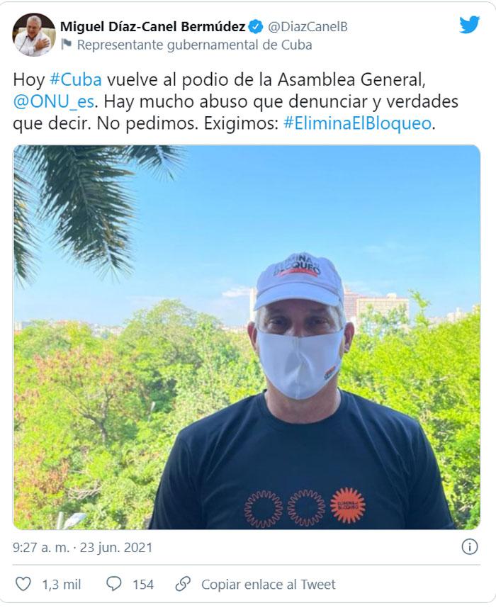 «Hoy #Cuba vuelve al podio de la Asamblea General, @ONU_es. Hay mucho abuso que denunciar y verdades que decir. No pedimos. Exigimos: #EliminaElBloqueo», escribió el mandatario.