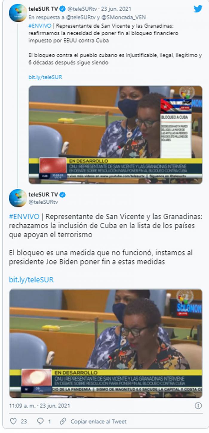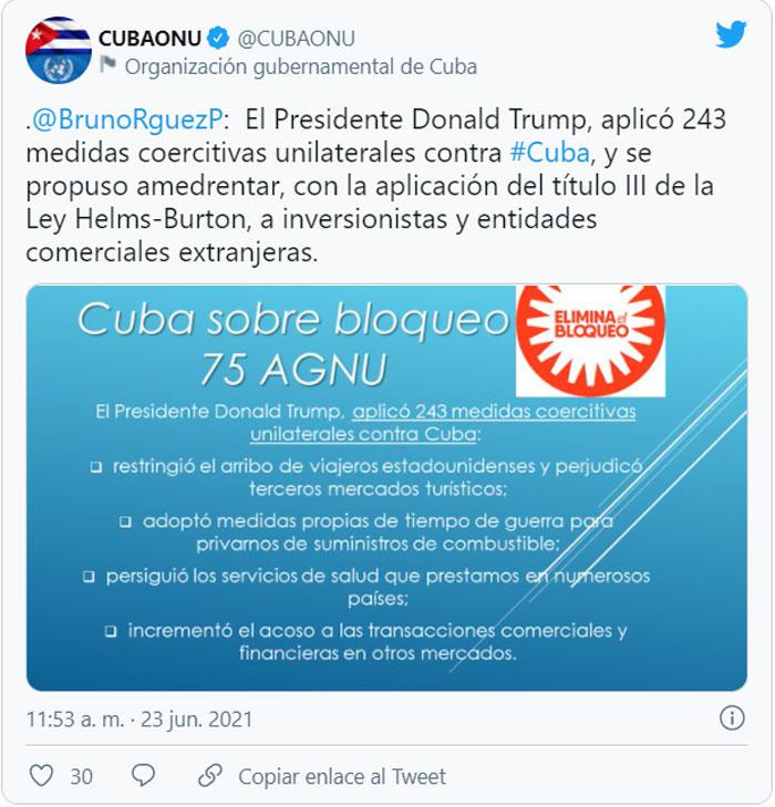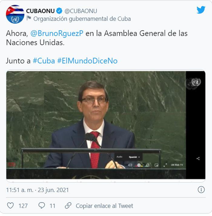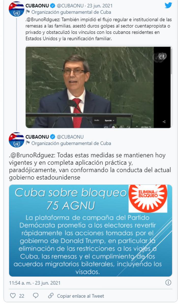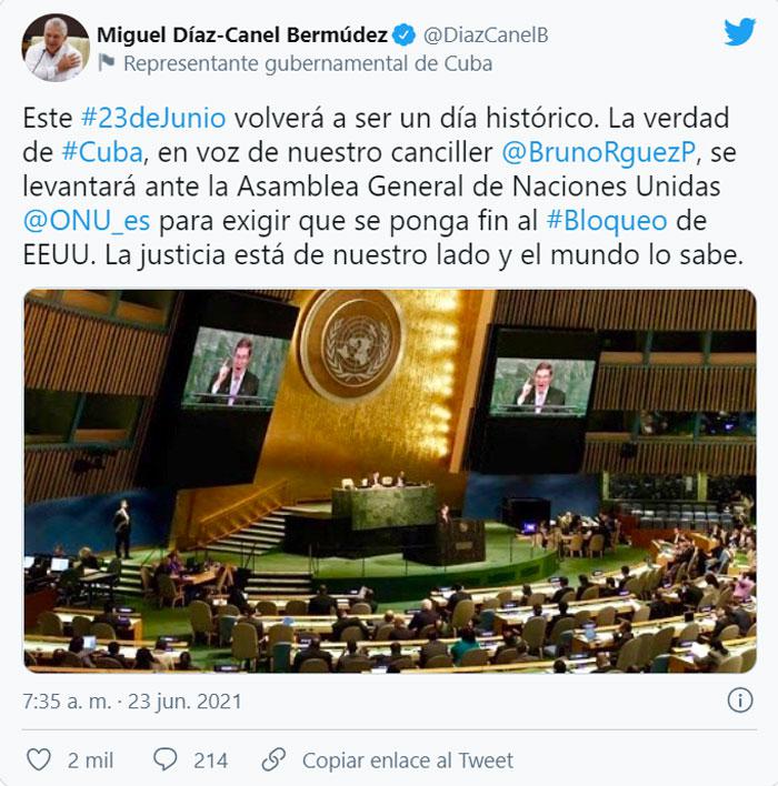 «Este #23deJunio volverá a ser un día histórico. La verdad de #Cuba, en voz de nuestro canciller @BrunoRguezP, se levantará ante la Asamblea General de Naciones Unidas @ONU_es para exigir que se ponga fin al #Bloqueo de EEUU. La justicia está de nuestro lado y el mundo lo sabe».