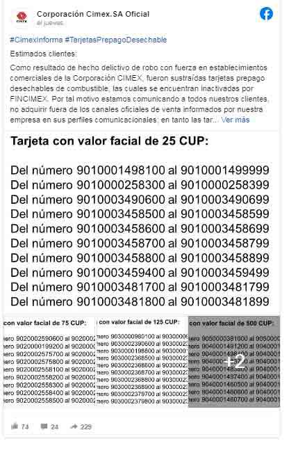 La Corporación CIMEX informó este lunes que, como resultado de un hecho delictivo de robo con fuerza en establecimientos comerciales de la Corporación, fueron sustraídas tarjetas prepago desechables de combustible, las cuales se encuentran inactivadas por FINCIMEX.