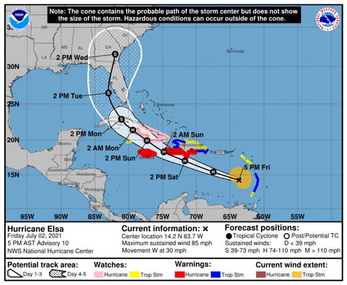 El huracán Elsa azotó al grupo sur de las Antillas menores y cruzó en horas de la mañana por las inmediaciones de las islas de Barbados, San Vicente y Santa Lucía, internándose en la tarde en aguas del mar Caribe oriental.