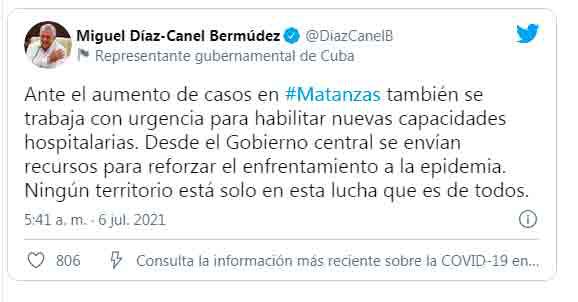 “Ante el aumento de casos en #Matanzas también se trabaja con urgencia para habilitar nuevas capacidades hospitalarias. Desde el Gobierno central se envían recursos para reforzar el enfrentamiento a la epidemia. Ningún territorio está solo en esta lucha que es de todos”, tuiteó Díaz-Canel.