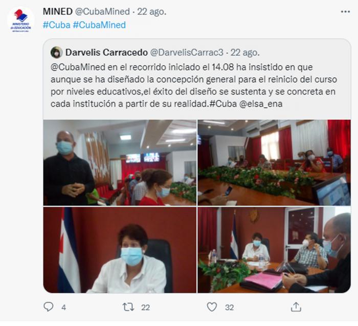 Por su parte, la Directora General de Gestión y Relaciones Estratégicas del organismo, Darvelis Carracedo Aguilar, dijo en la red social Twitter que aunque se ha diseñado la concepción general para el reinicio del curso por niveles educativos, el éxito del diseño se sustenta y se concreta en cada institución a partir de su realidad.