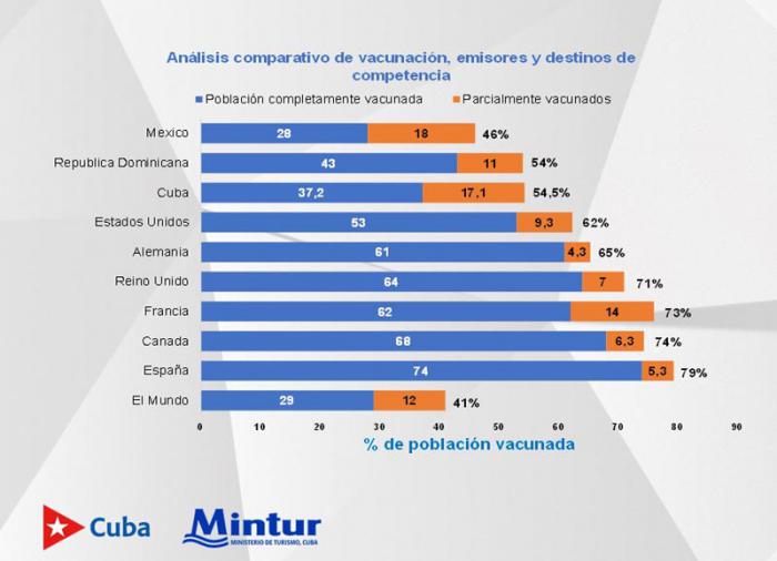 “Canadá, el primer emisor hacia Cuba, está ya al 74% de vacunados con alguna dosis; Francia, Reino Unido, Alemania y España también tienen altas cifras. Por su parte, Cuba ya tiene vacunada a su población con una dosis al 54.5 %; con dos dosis, 42.2%, y con las tres dosis, 37.2 %. En total, más de 15 millones de dosis han sido aplicadas.