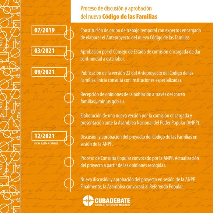 “Desde el 16 de julio de 2019, a partir de la promulgación de la Constitución, se constituye este grupo de trabajo que, coordinado por el Ministerio de Justicia, se integró por reconocidos expertos en estas materias y por un grupo de instituciones importantes del país muy ligadas a los temas del derecho familiar, como el Tribunal Supremo Popular, la Fiscalía General de la República, el Ministerio de Salud Pública y de Relaciones Exteriores, la Organización Nacional de Bufetes Colectivos, la Unión Nacional de Juristas de Cuba, la Federación de Mujeres Cubanas, el Cenesex, la Facultad de Derecho de la UH, la ONEI”.