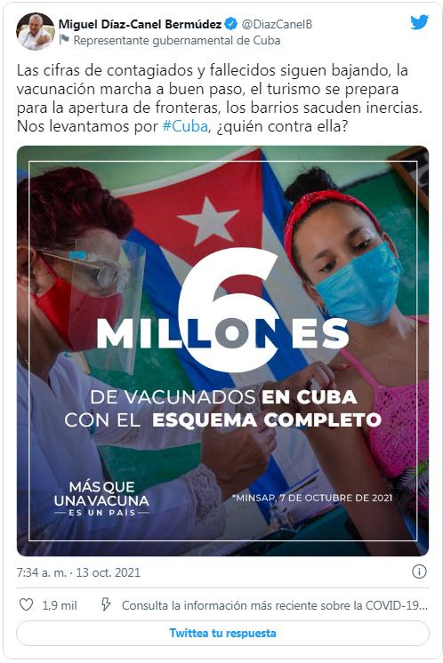 “Las cifras de contagiados y fallecidos siguen bajando, la vacunación marcha a buen paso, el turismo se prepara para la apertura de fronteras, los barrios sacuden inercias. Nos levantamos por #Cuba, ¿quién contra ella?”, tuiteó el jefe de Estado.