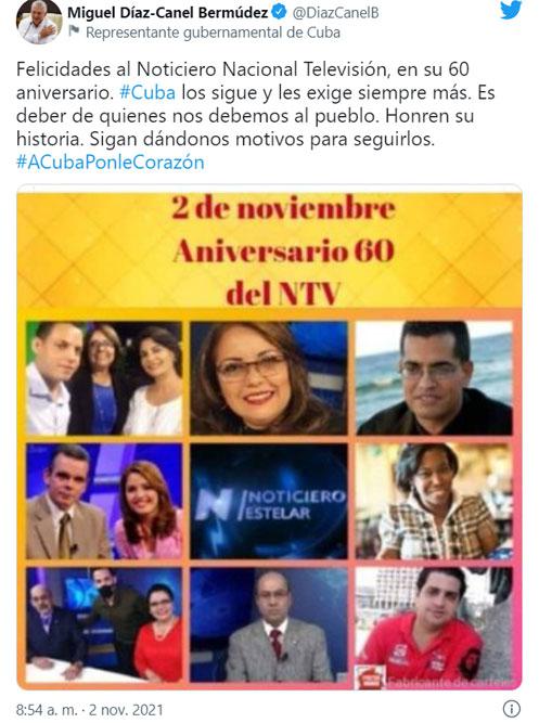 "Felicidades al @Noticiero Nacional Televisión, en su 60 aniversario. #Cuba los sigue y les exige siempre más. Es deber de quienes nos debemos al pueblo. Honren su historia. Sigan dándonos motivos para seguirlos".