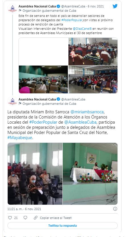 "Este fin de semana en todo el país se desarrollan sesiones de preparación de delegados del #PoderPopular,con vistas al próximo proceso de rendición de cuenta.Visualizan intervención del Presidente @DiazCanelB en reunión con presidentes de Asambleas Municipales el 30 de septiembre", tuiteó el Parlamento cubano.