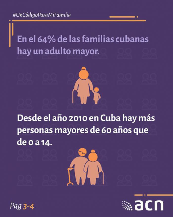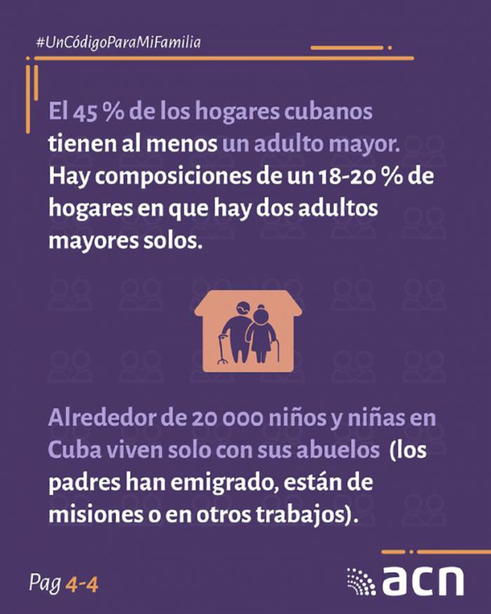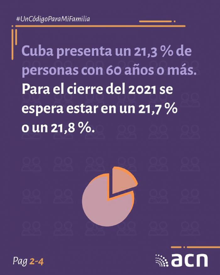 El 21,3 % de la población de Cuba es de 60 años y más, lo cual duplica la existente hace cuatro décadas, y se estima que en el 45 % de los hogares están presentes los adultos mayores, la mayoría con un rol de abuelos.