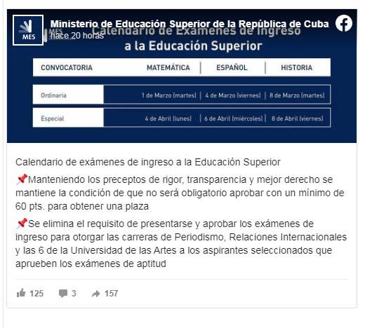 El Ministerio de Educación Superior (MES) dio a conocer este martes el calendario para los exámenes de ingreso, que se realizarán entre el 1 de marzo y el 8 de abril en convocatoria ordinaria y especial.