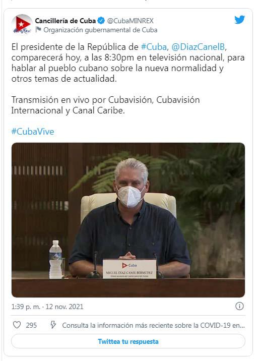 "El presidente de la República de #Cuba, @DiazCanelB, comparecerá hoy, a las 8:30pm en televisión nacional, para hablar al pueblo cubano sobre la nueva normalidad y otros temas de actualidad. Transmisión en vivo por Cubavisión, Cubavisión Internacional y Canal Caribe", tuiteó la Cancillería cubana.