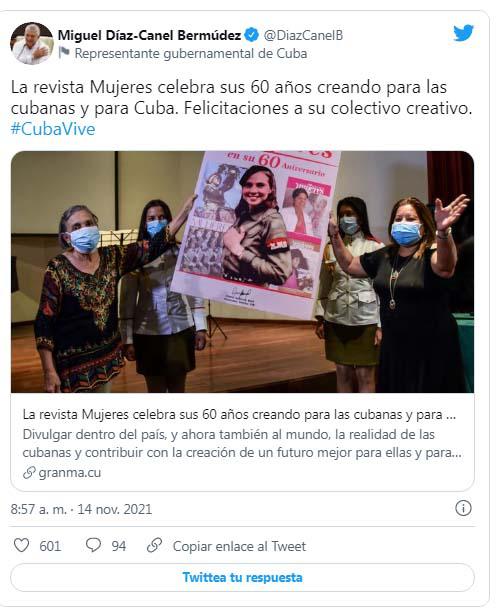 Miguel Díaz-Canel Bermúdez, Presidente de la República de Cuba, felicitó hoy en su cuenta en Twitter a la revista Mujeres, a cuyo colectivo calificó de creativo.