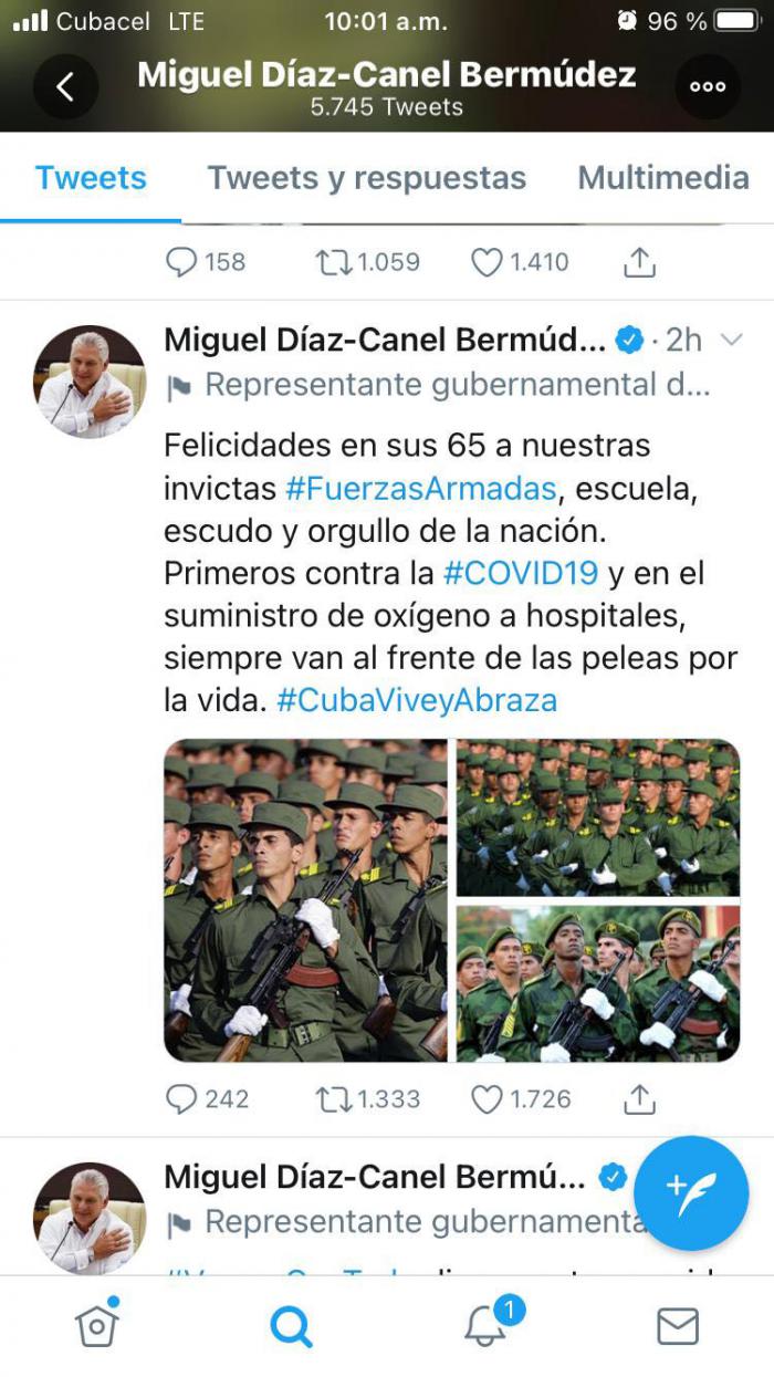 “Felicidades en sus 65 a nuestras invictas #FuerzasArmadas, escuela, escudo y orgullo de la nación. Primeros contra la #COVID19 y en el suministro de oxígeno a hospitales, siempre van al frente de las peleas por la vida. #CubaViveyAbraza”, escribió en Twitter Díaz-Canel.