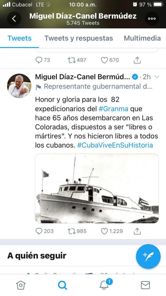 “Honor y gloria para los 82 expedicionarios del #Granma que hace 65 años desembarcaron en Las Coloradas, dispuestos a ser "libres o mártires". Y nos hicieron libres a todos los cubanos. #CubaViveEnSuHistoria”, tuiteó el Presidente cubano.