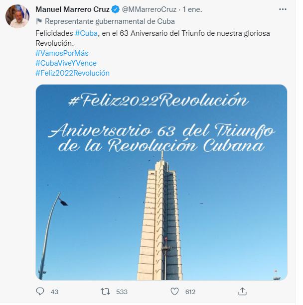 En su mensaje en esa red social Marrero Cruz felicitó al pueblo cubano en este 1ro de enero y calificó de “gloriosa” a la Revolución cubana.